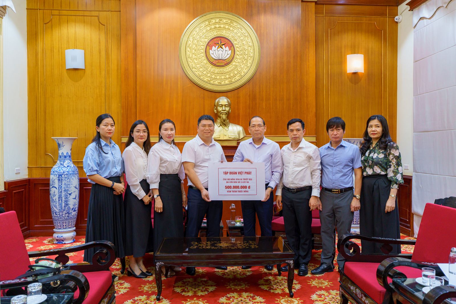 Ông Hoàng Công Thủy, Phó Chủ tịch Ủy ban Trung ương Mặt trận Tổ quốc Việt Nam đã tiếp nhận 500 triệu đồng từ TẬP ĐOÀN VIỆT PHÁT để tiếp tục phân bổ đến các tỉnh, thành.