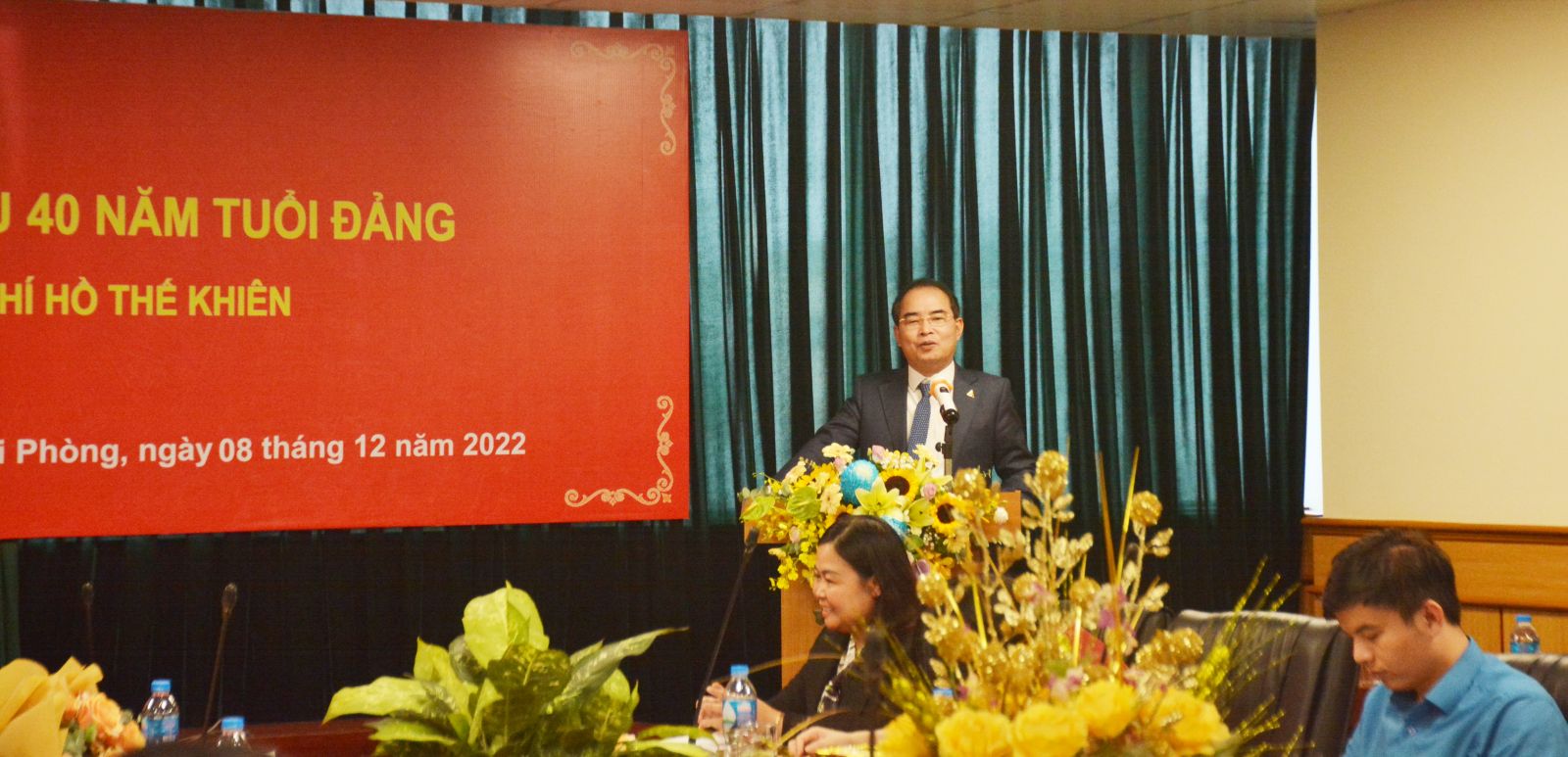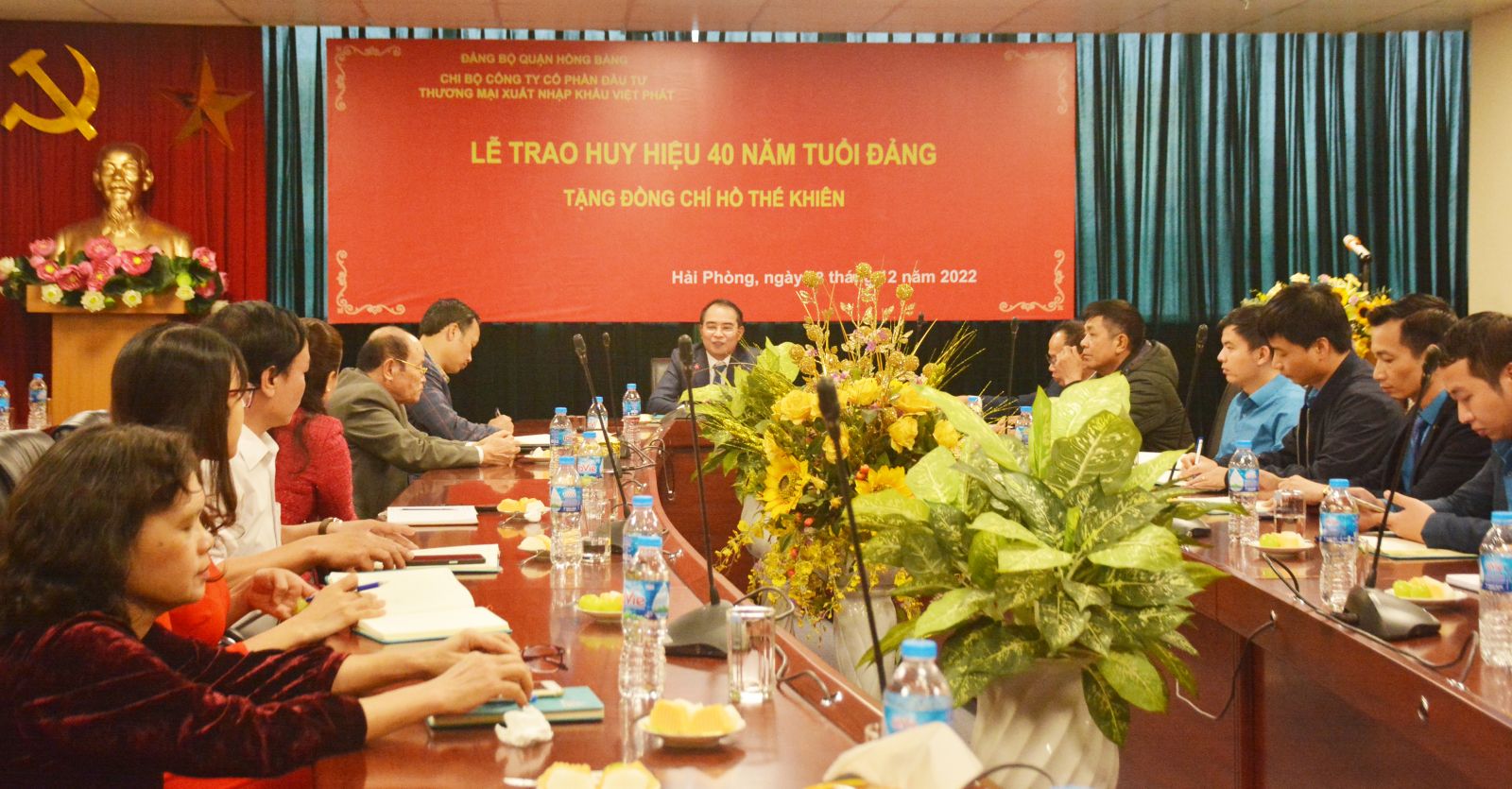 Tại buổi lễ Đồng chí Hồ Thế Khiên trân trọng cảm ơn chi bộ Đảng Việt Phát, Đảng bộ quận Ủy Hồng Bàng đã tổ chức buổi lễ rất long trọng, bày tỏ niềm vinh dự và vui mừng khi được nhận Huy hiệu Đảng. Đồng chí cũng bùi ngùi, xúc động hồi tưởng lại ngày đồng chí được kết nạp vào Đảng khi đang chiến đấu tại chiến trường. Trong 40 năm qua, đồng chí cảm thấy vinh dự được đứng trong hàng ngũ của đảng, được học tập, trưởng thành, được Đảng rèn luyện cho đến ngày hôm nay.